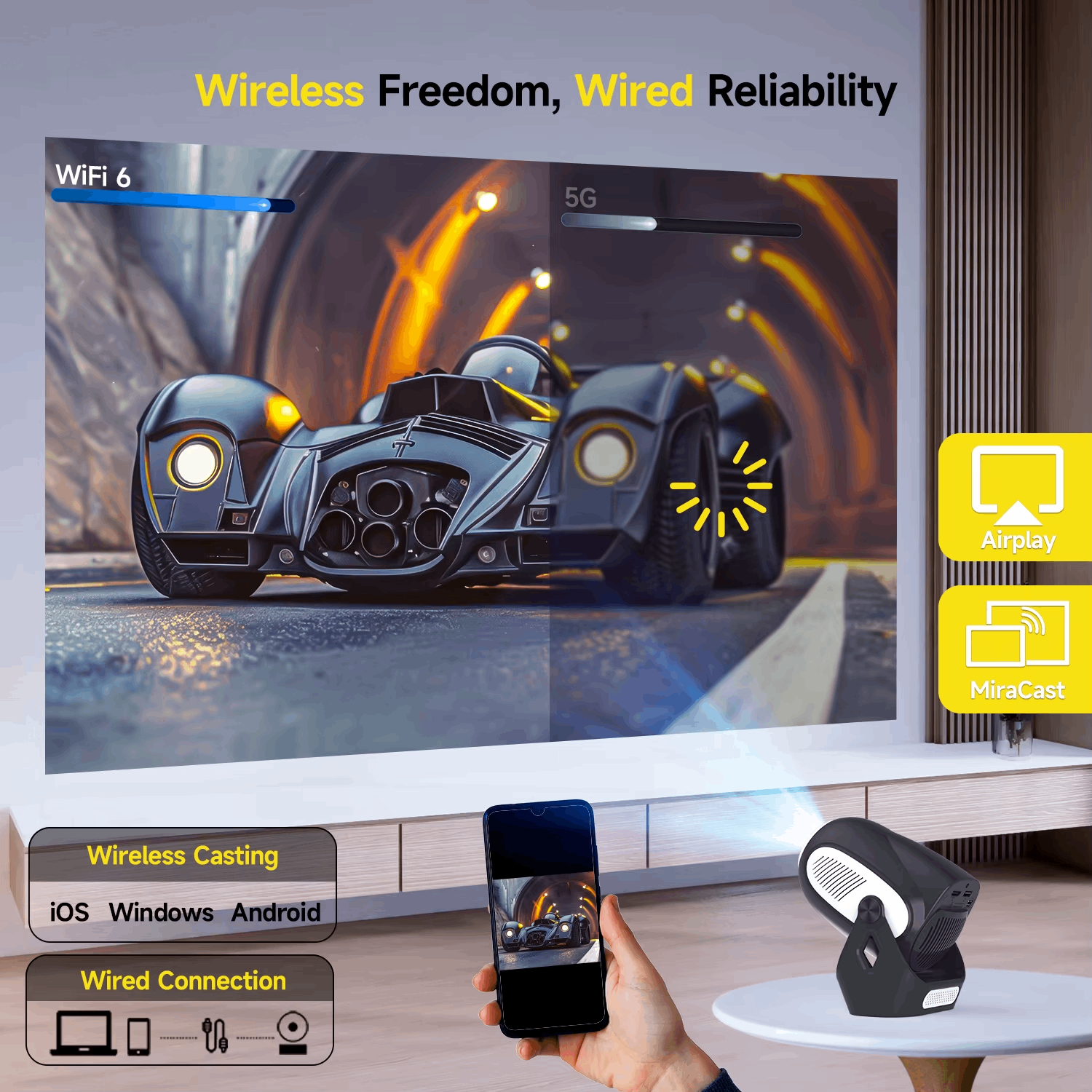 Connecting is easy and versatile. The HY300 X features advanced WiFi 6 and supports both 5Ghz and 2.4Ghz bands for stable, high speed connection. You can wirelessly cast your screen directly from any iOS, Windows, or Android device using built-in protocols like AirPlay (for Apple devices) and MiraCast (for Windows/Android). There's no need for extra dongles, just select the projector from your device's screen mirroring menu.